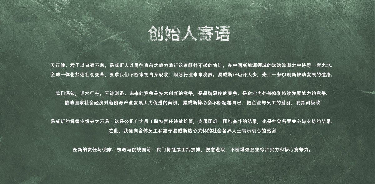易威斯以(yi)技術為(wei)責任(ren)驅動,不斷(duan)創新與探索新的(de)充電產品和解決方案。十多(duo)年的(de)經驗(yan)累積(ji)讓我(wo)們更(geng)注重于每一個細節。易威斯非(fei)常重視(shi)及(ji)關心我(wo)們的(de)客(ke)戶、和員工,就像關心我(wo)們的(de)地球環(huan)境一樣。以(yi)人為(wei)本,讓清潔新能(neng)源(yuan)更(geng)好的(de)融(rong)入日常生活。